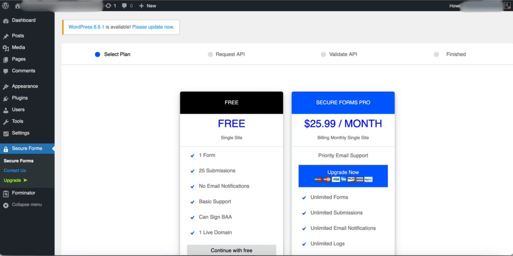 Once you’ve set up your form click on Plugins and then Add New. In the search bar type in Secure Forms select it from the results and click Install Now. After installation click Activate to enable the plugin on your site. Go through the 4 step wizard and then click on Select Form and select the form you want to be encrypted & secure. Once you save it all submissions will be routed through Secure Forms and will not be stored on your database unsecurely.